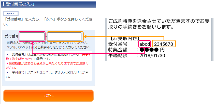 最初のアルファベット4文字を左の枠に、残りの数字を右側の枠に入力します。(コピー&ペースト(貼り付け)することをお勧めします。)