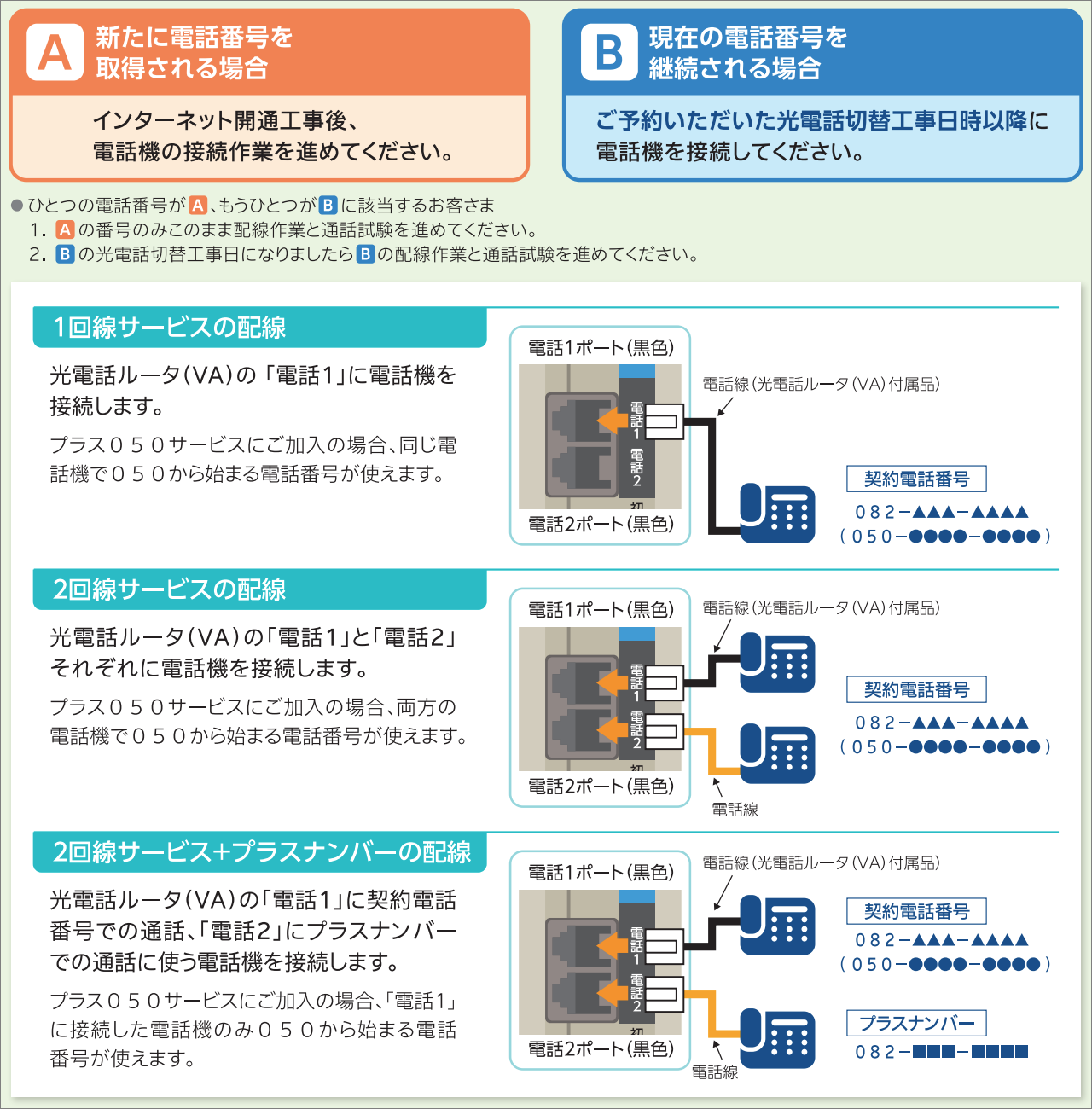 光電話ルータ(VA)への電話機の接続は、ご利用になる電話番号の種類によって作業するタイミングが異なり、ご加入のサービスによって配線の位置も異なります。