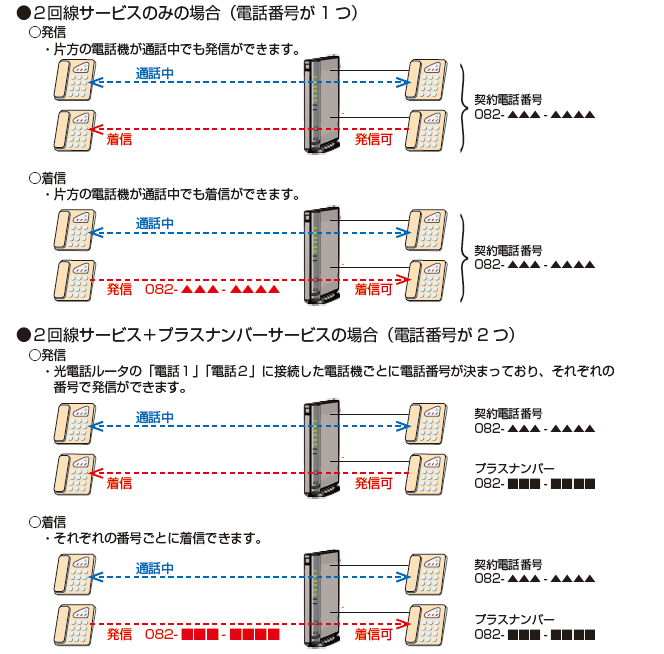 2回線サービスと2回線サービス+プラスナンバーサービスは、どちらも同時に最大2通話が可能ですが、それぞれ発着信の動作が異なります。